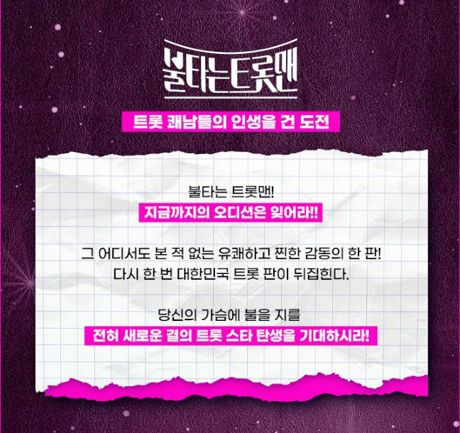 이번에 새로 시작하는 예능 프로그램이 있어서 간단히 소개한다. 트로트 좋아하시는 분들은 아마 필수로 보셔야 될 듯?